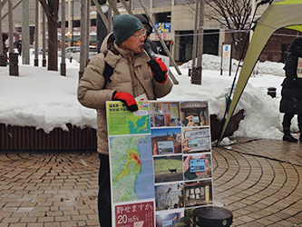 今年最初の青森金曜日行動は178回目で、元日の15時より青森駅前公園で行われました。大竹進医師もマイクを握り、年末の12/29に福島県の避難区域などを廻ってきた報告をしました。「フクシマは終わっていません。私たちは、フクシマを忘れてはならない」